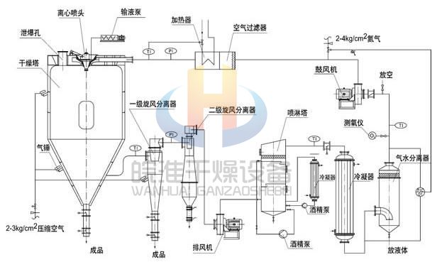 閉式循環(huán)噴霧干燥機(jī)系統(tǒng)由噴霧干燥機(jī)主機(jī)、帶空氣過濾器的加熱器、鼓風(fēng)機(jī)、水氣分離器、大小冷卻塔、噴淋塔、排風(fēng)機(jī)、一級旋風(fēng)分離器、二級旋風(fēng)分離器、泵、測氧儀以及管路與控制閥等組成。